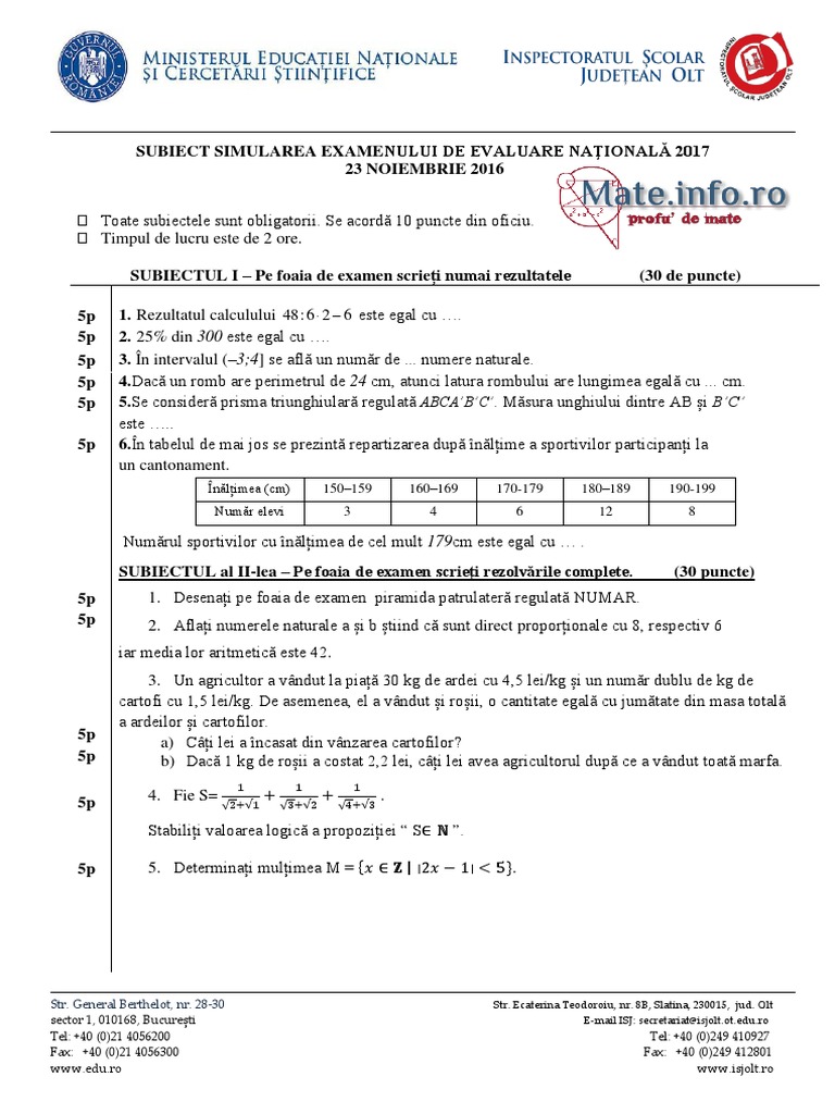 Aveți mai jos rezolvarea detaliată a subiectelor și baremul de corectare en 2017 viii matematică ( sesiunea sursa subiecte pdf subiecte2017.edu.ro. Pot fi accesate rezultatele pe. După care, a doua zi, cei care au susținut probele de. Probele scrise pentru evaluarea naţională încep la ora 9.00, moment în care se deschid plicurile sigilate care conţin varianta de subiecte multiplicată în fiecare sală în care se susţine examenul. Succes tuturor la afișarea rezultatelor și la admiterea în liceu !