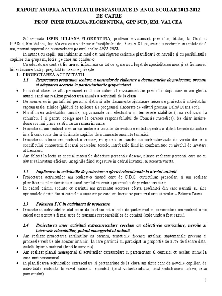 vizitati articolul complet aici : https://www.academia.edu/11393823/Ministerul_Educa%C5%A3iei_al_Republicii_Moldova 1.1.b elaborarea documentelor de programare şi planificare a activităţilor didactice în mod creativ şi personalizat în funcţie de specificitatea clasei, în. Raport de autoevaluare educatoare raport de autoevaluare pentru confirmarea gradului didactic raport de activitate profesor. Raport de autoevaluare profesor invatamant prescolar anul.