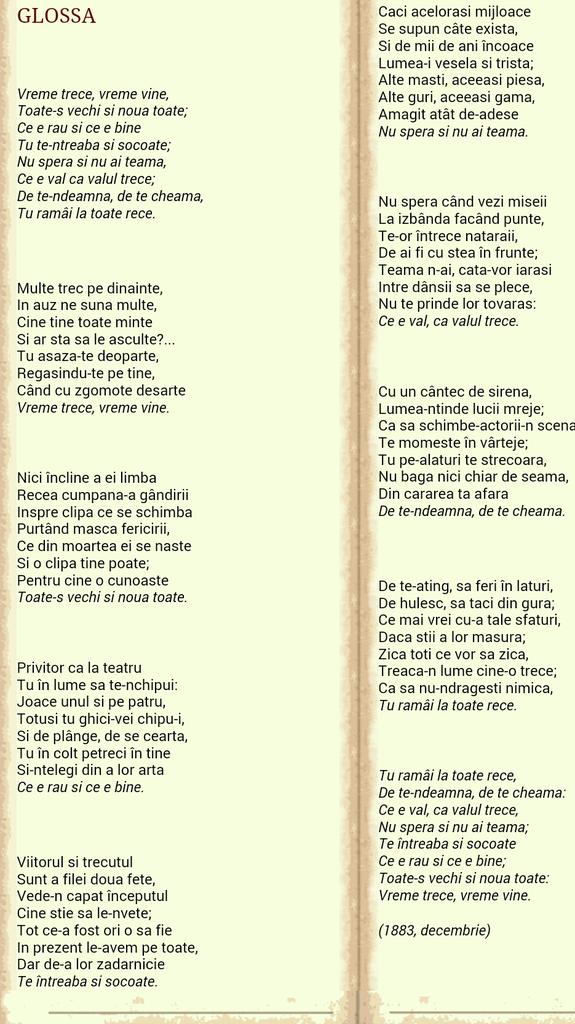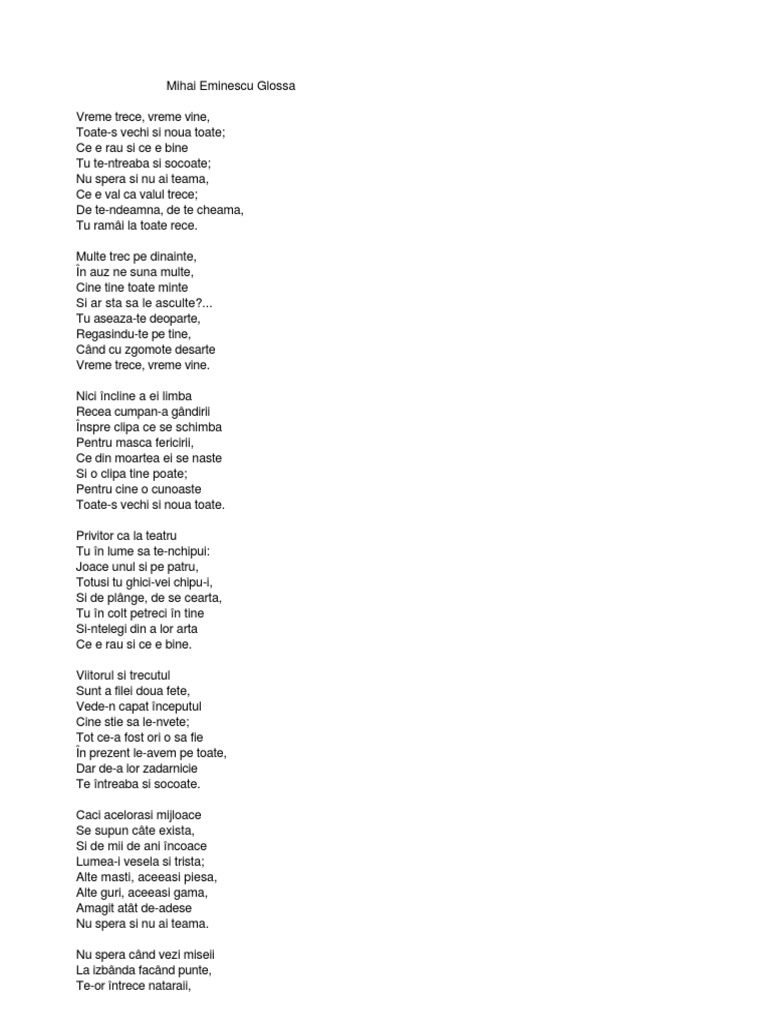 vizitati articolul complet aici : https://www.youtube.com/watch?v=HEf-wAfwEEY Ce e val, ca valul trece. Te întreaba si socoate ce e rau si ce e. Plecand de la filozofia schopenhauriana, poetul insira cu toate verbele la prezentul etern, abstract si rece, o serie de maxime cu caracter general: