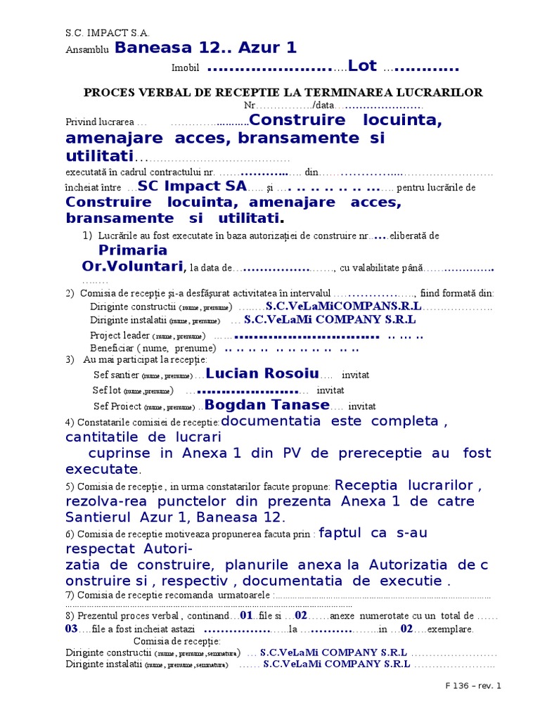 Au mai participat la receptie comisia de receptie in urma constatarilor facute, propune (terti) pentru executarea lucrarii de. Proces verbal de receptie la terminarea lucrarilor.